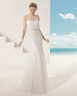 ELISABET. Vestido bordado pedreria y tul en color natural.
